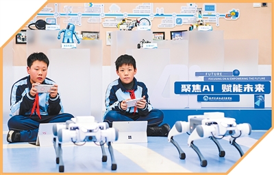 浙江省杭州市保俶塔实验学校学生在人工智能通识课上学习给机器狗编程。