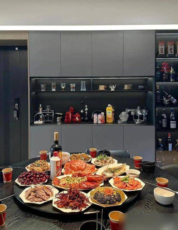 圆桌是深色胡桃木直径一米五八口之家涮羊肉也不挤转一圈人人夹得到菜餐边柜暗藏小冰箱饮料随手拿再也不用跑厨房这不就是懒人福音?