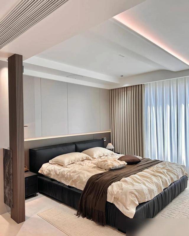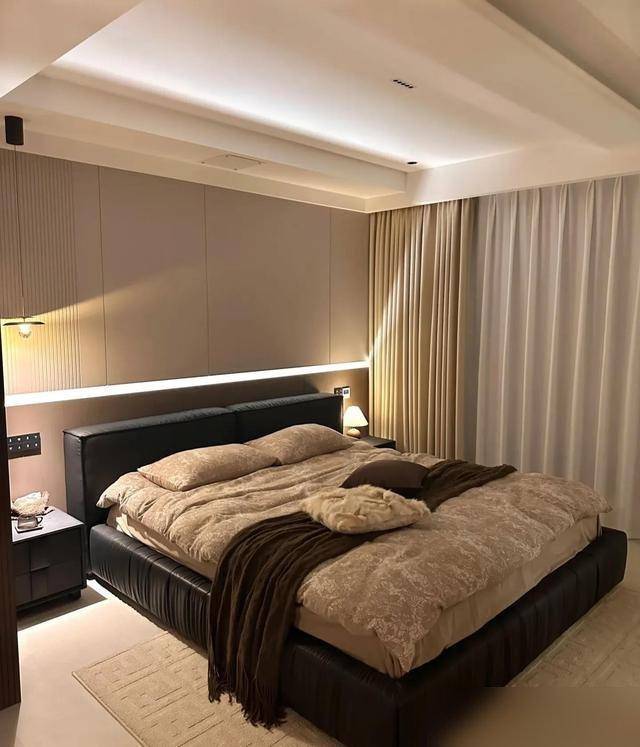 主卧走暖咖路线床头木饰面+硬包软硬兼施像靠进现烤面包墙窗帘纯色雾面遮光度95%周末赖床到中午阳光也吵不醒你衣帽间藏在过道两侧换季被褥行李箱全吞得下关上门一秒清爽。