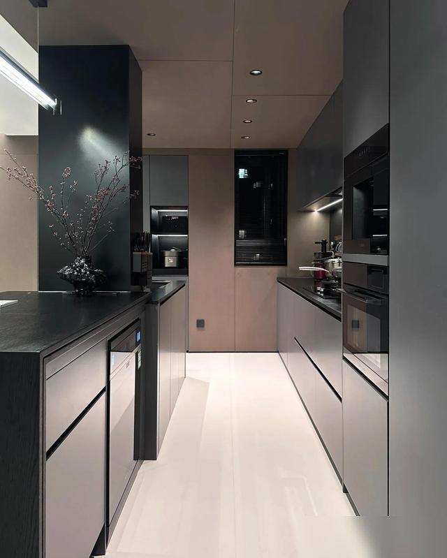 厨房干脆拆墙做开放式双一字深灰门板免拉手台面选深黑石英砂耐脏到炸中餐爆炒也能稳得住油烟机挑侧吸加挡烟板辣椒下锅都不呛隔壁猫。