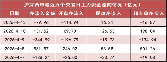 今日沪深两市主力资金开盘净流出114.94亿元,尾盘净流入16.21亿元,全天净流出79.96亿元。