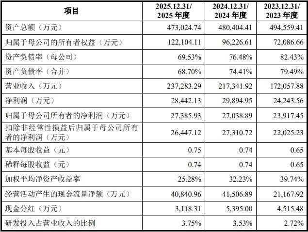 2023年至2025年,理奇智能实现营业收入分别为172,057.88万元、217,341.92万元和237,283.29万元,归属于母公司所有者的净利润分别为23,917.45万元、27,038.89万元和27,385.93万元,扣除非经常性损益后归属于母公司所有者的净利润分别为22,025.23万元、27,310.72万元和26,447.12万元。