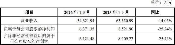 2026年1-3月,理奇智能实现营业收入54,621.94万元,较上年同期下降14.05%;归属于发行人股东的净利润为6,371.35万元,较上年同期下降25.24%;扣除非经常性损益后归属于公司股东的净利润为6,121.48万元,较上年同期下降25.43%;经营活动产生的现金流量净额为9,625.87万元。