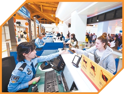 海南海口出入境边防检查总站凤凰边检站执勤民警为旅客办理边检手续。